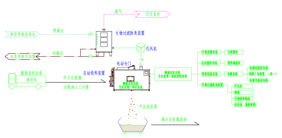 餐廚有機(jī)垃圾生化處理一體機(jī)集成了:自動(dòng)投料裝置、電動(dòng)倉(cāng)門、自動(dòng)攪拌裝置、智能恒溫系統(tǒng)、生物過(guò)濾除臭裝置、微生物發(fā)酵系統(tǒng)。實(shí)現(xiàn)了模塊化安裝維護(hù)的設(shè)計(jì)要求。